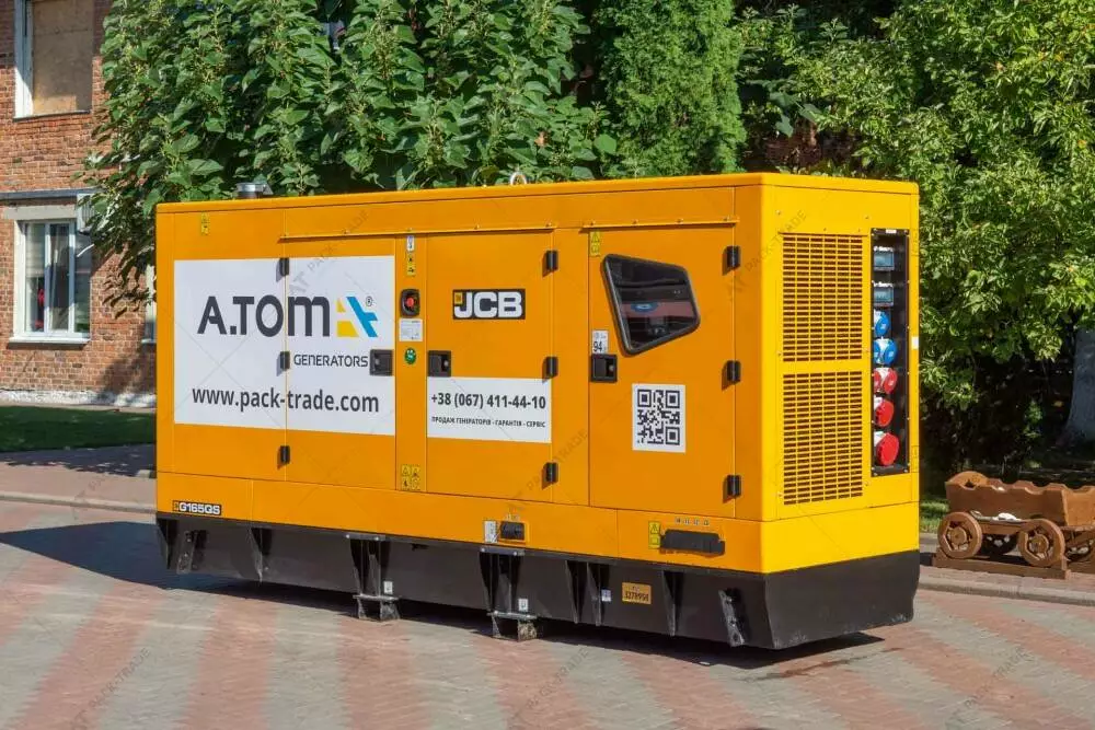 Дизельний генератор JCB G165QS 165 кВА. Максимальна потужність 132 - кВт. Витрати палива при 100% навантаженні 35 л/год. Об'єм паливного баку 360 л