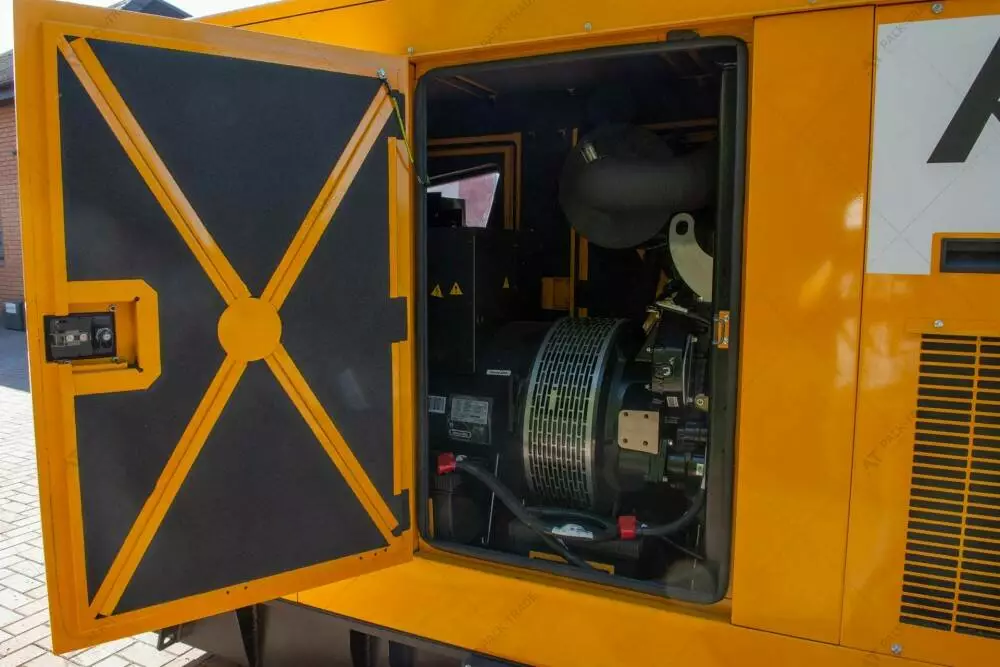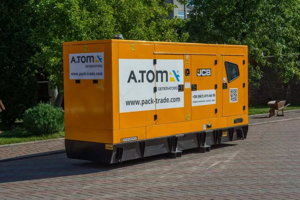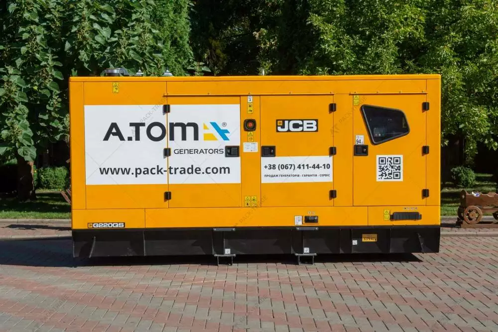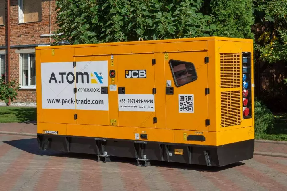 Дизельний генератор JCB G220QS. Максимальна потужність 176 кВт. Витрати палива при 100% навантаженні 41,6 л/год. Об'єм паливного баку 360 л