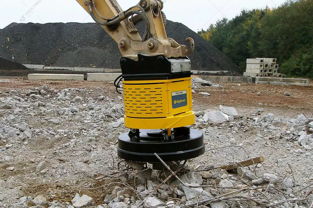 Гідравлічний магніт Epiroc HM2000 на екскаватор. Вага машини-носія — 15-45 т. Гідравлічні магніти серії HM чудово впораються зі збором цінного металевого брухту. У результаті місце виконання робіт стає чистішим і безпечнішим для іншого обладнання, а зібраний брухт може бути перероблений, що є джерелом додаткового прибутку.