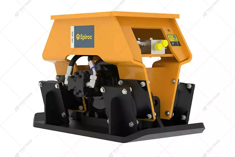 Віброплита Epiroc HC350 на екскаватор. Вага машини-носія — 3-8 т. Віброплити серії НС — це тихе, ефективне і просте в позиціонуванні обладнання, яким легко керувати. Гідравлічні віброплити призначені для ущільнення траншей і насипів, вирівнювання ґрунту, забивання паль, стовпів і елементів опалубки.
